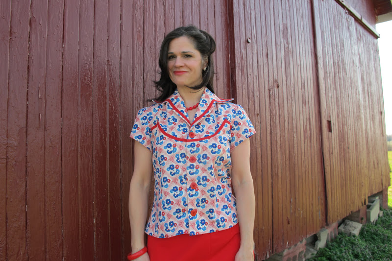 What can I say about this outfit? It's a bit of a surprise to me, as I didn't expect this project to fall into place, but I love it. The blouse came from an unmarked, mail order, dress pattern. Last year I started making the dress, but the skirt didn't seem to fit or line up with the bodice. I thought of grading it (truing) and did, but there were other issues. So after many attempts at making the dress, it was thrown into the UFO pile. I finally got back to it and decided to draft a new bodice using parts of the pattern. I am not a fan of the edge stitched pleats included on the original bodice, although edge stitched pleat look pretty on the ironing board, they did nothing for my waistline. Anyway, after a year of sitting in a basket this UFO is solved! I really like the added trim for fun. And of course I paired it with yet another ginger skirt in cherry red. The ginger has become a staple in my wardrobe. I have to say, I enjoy them plain, out of the box, but I think I am ready for some pockets or piping next time.